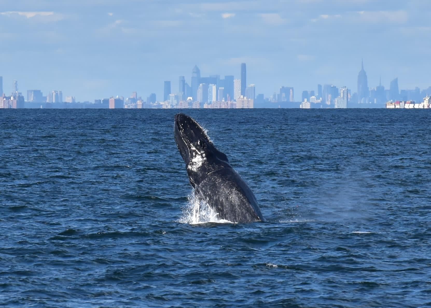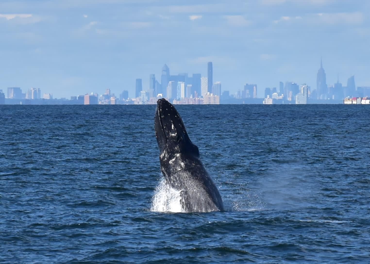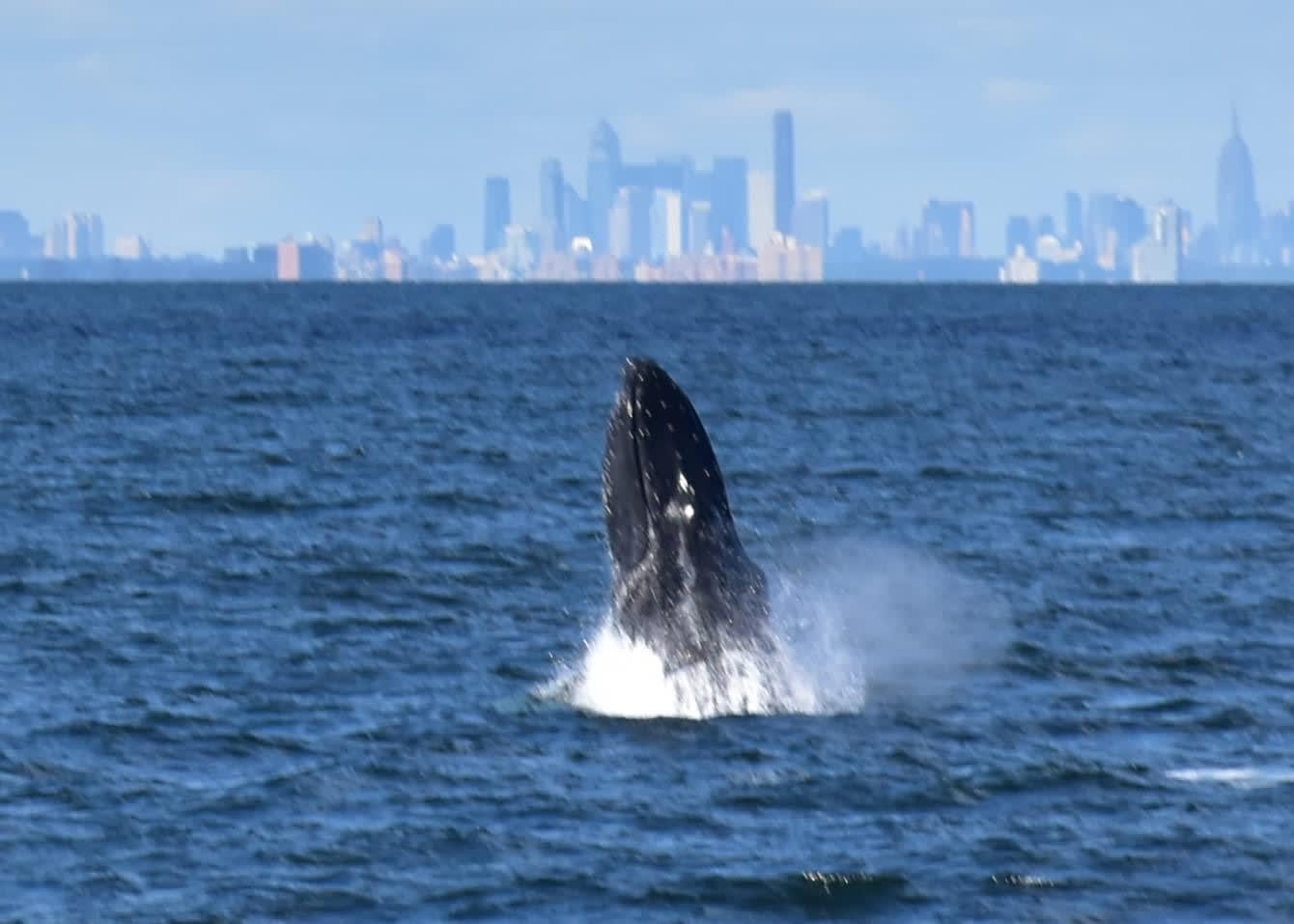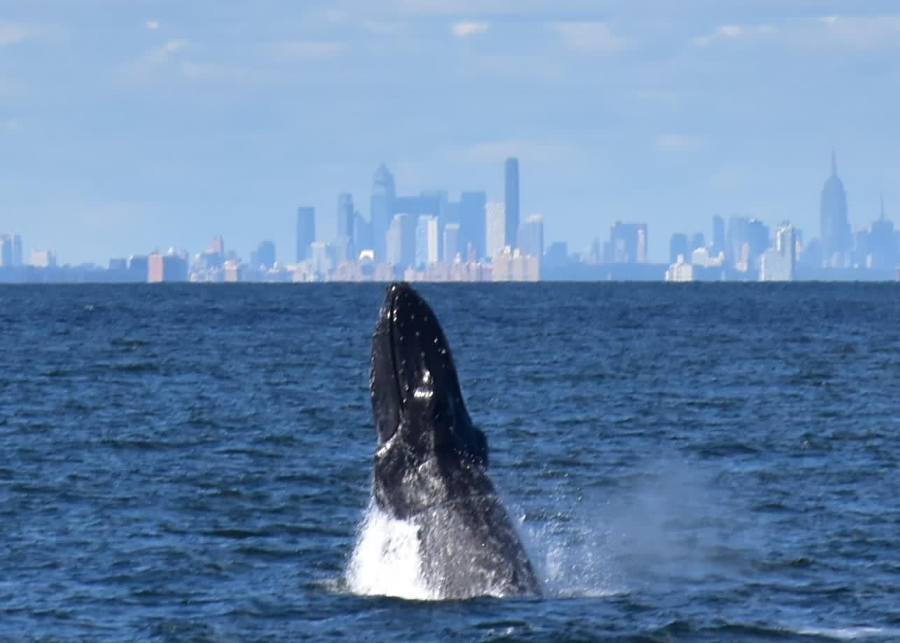 Wednesday was a beautiful flat day on the ocean and the smaller crowd was rewarded with a great show:Here are some awesome photos by passenger Sandy, who has been going whale watching with us for years. Join us soon, enjoy Sandy’s photos with NYC in the background. Get tickets now 732.592.6400