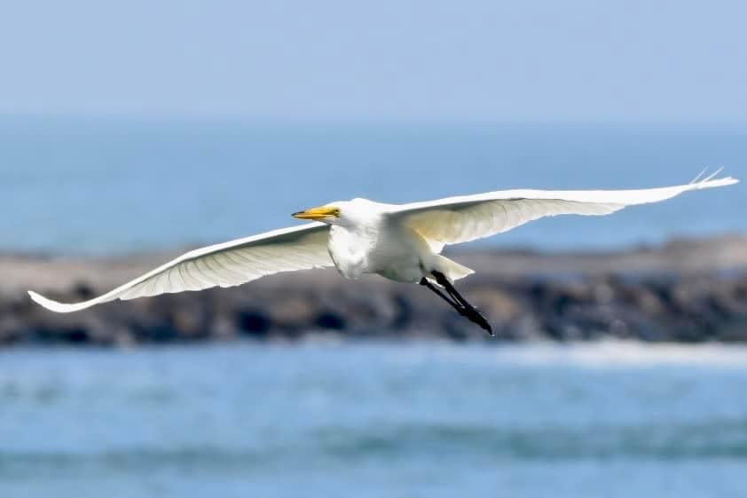 When leaving my house today to go whale watching it was pouring. Just a few minutes earlier, the sun was out shining brightly! Radar said we should be good so off I went and I was so glad I did. Still at the dock, the great Egret was near by! Then as we headed out the inlet, one came flying right towards us! As we come out to the ocean, there was a haze/fog and some dark clouds but we headed east/north east. So many bait balls with the fish jumping and being scared of something but did not see anything come through these fish area. The water has been cold but now it must be warming because so many more fish are around. This should make the whale watching even more exciting in the near future!