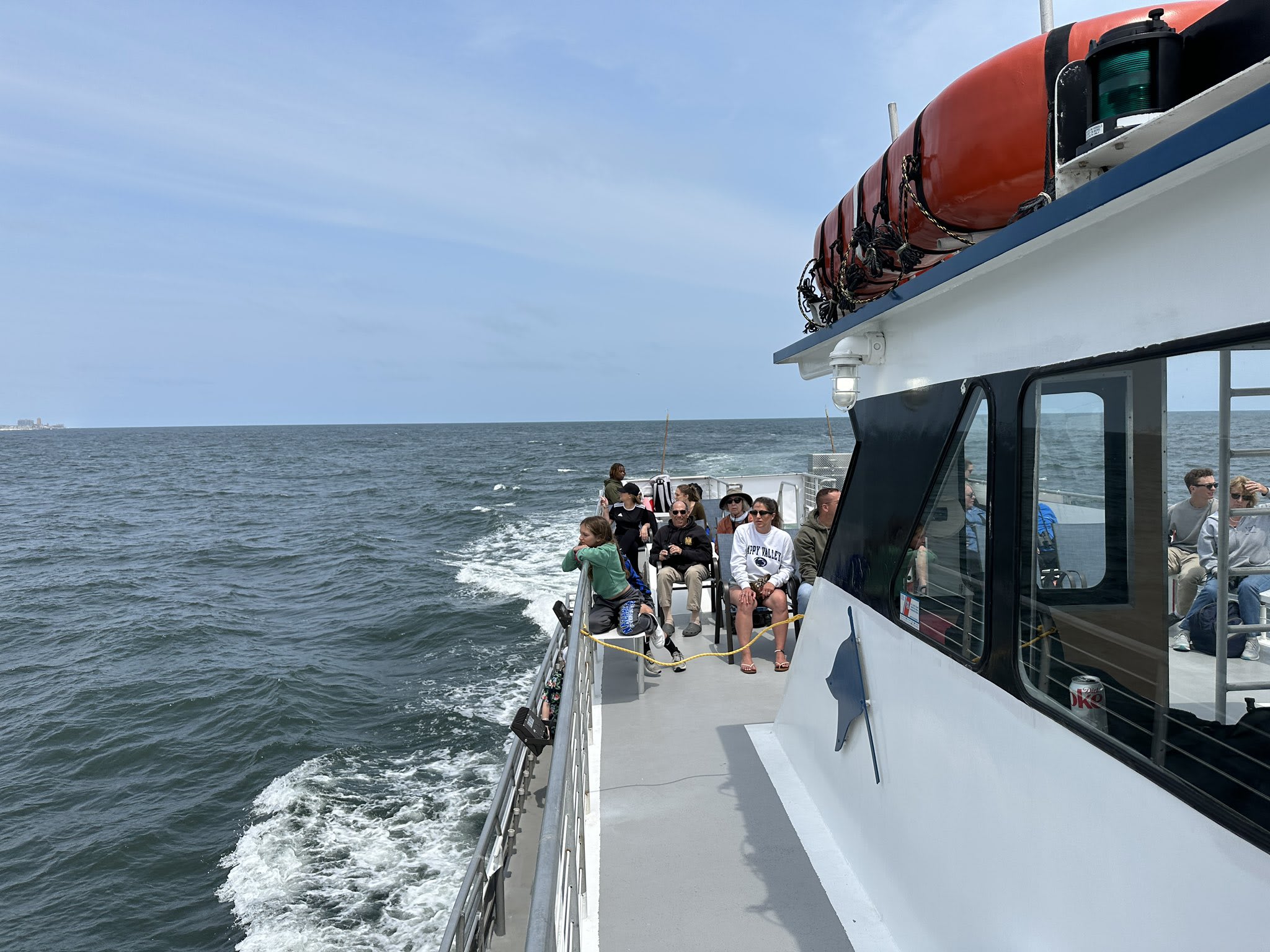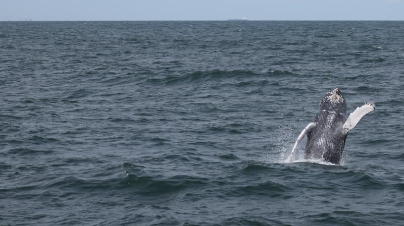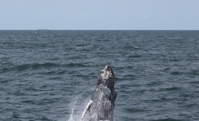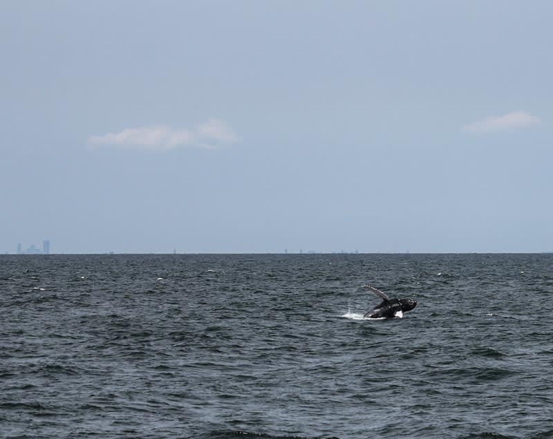 Tuesday, June 20th: Yesterday was one of the best whale watching trips of the entire season! It started as an overcast day where we started going South into Spring Lake to possibly find a whale that had been spotted down there. After some time of not seeing anything we then turned around by Manasquan. We began heading North passing Asbury, Long Branch and Monmouth Beach. After spending some time with a large group of bottlenose dolphins the sun started to come out and we spotted a breaching whale out in the distance a few miles ahead of us. Once we got up to him this whale breached almost 15 times in a row right in front of the boat for all guests to enjoy and film! This whale was the most active one we have seen since the start of the season and was definitely putting on a show for all of us! He was breaching, lunge feeding, flipper and tail slapping repeatedly for almost 30 minutes straight. Guests of all ages were beyond excited and had a blast!
