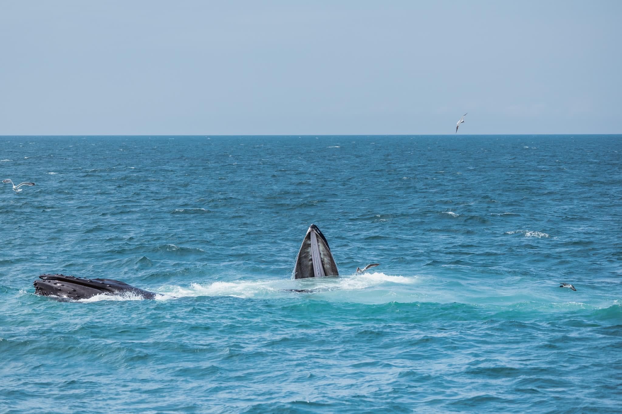 As we ventured further, we found ourselves surrounded by a sea of humpback whales. We counted at least 20 individuals, including a mother and her calf. They were everywhere, displaying every possible behavior. We even witnessed bubble feeding, a coordinated effort where two or more whales drive fish to the surface. My expectations were already high, having heard that it was like a National Geographic special out there, but what we saw surpassed anything I could have imagined.
